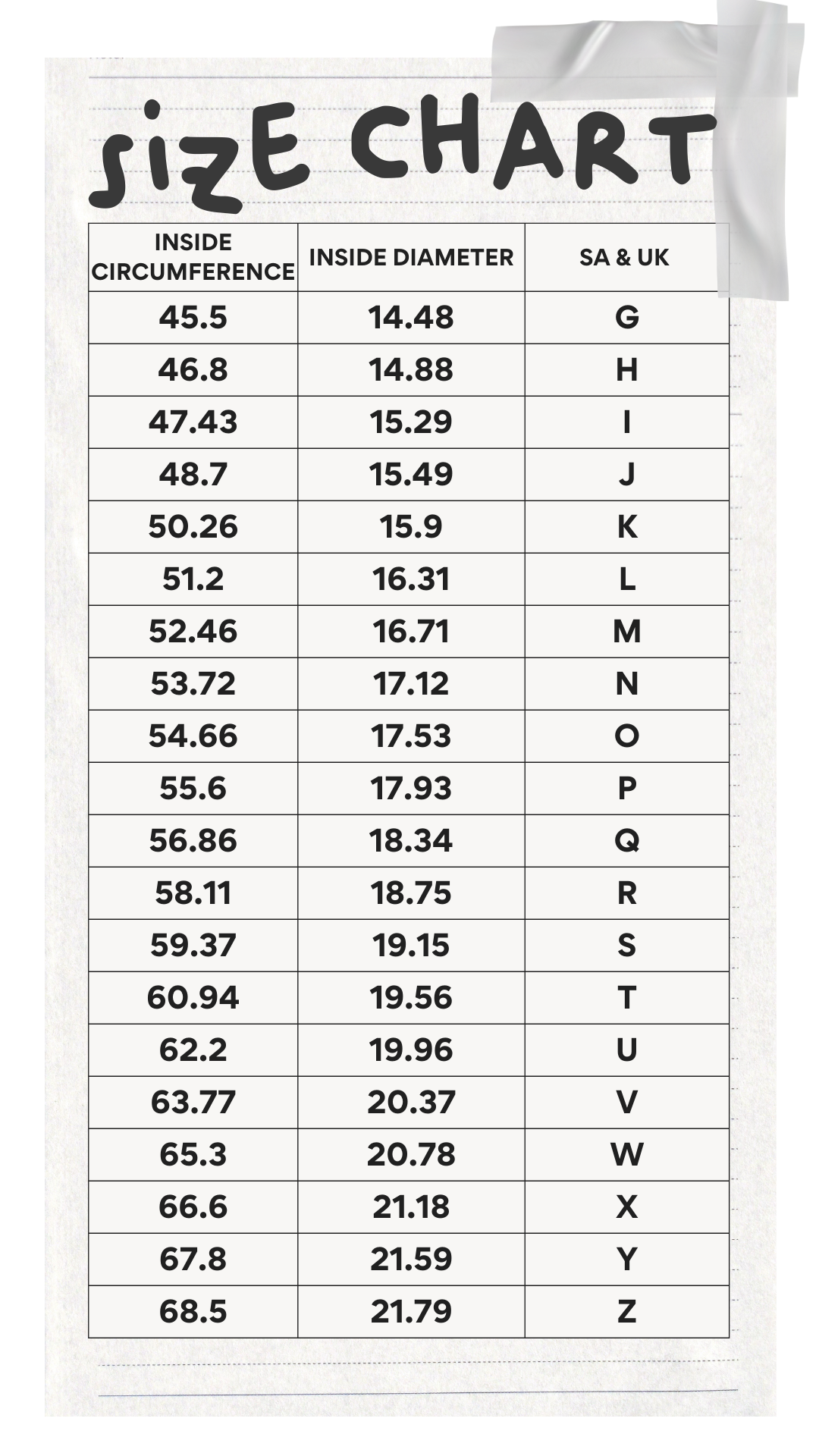 If getting to a jeweller isn’t possible, use the conversion chart below along with the measuring guide. Take your time: measure more than once and at different times of the day, as fingers can shift slightly with temperature.